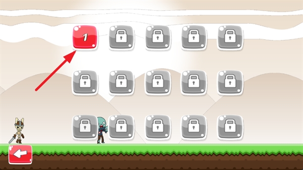 2、画面出现一排灰色锁和红色数字1时,点那个被红框标出的数字1开始第一关,左下角箭头是返回按钮。