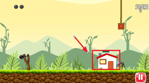 4、看到TNT炸药箱和蓝僵尸时,用弹弓打中TNT箱子炸僵尸,打中得分,想暂停点右下角粉色按钮。