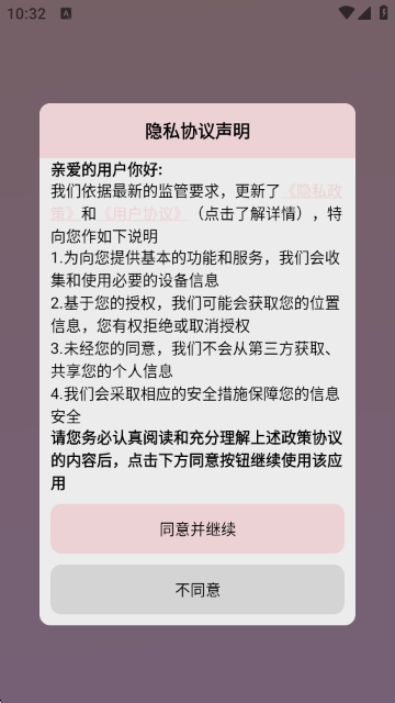 1、同意隐私协议:首次打开APP,阅读隐私协议声明后,点击“同意并继续”,进入应用。