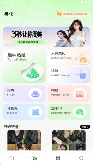 3、在美化页面中提供了趣味贴纸、人像美化、换装、滤镜、相框、马赛克以及加水印等功能;
