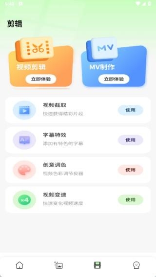 4、在剪辑页面中有视频剪辑、MV制作、视频截取、字幕特效、创意调色以及视频变速等功能。