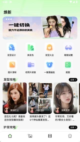 1、在首页中提供了发型设计、换发型、发型大全、眼镜试戴、图片清晰、老照片修复、一键漫画脸及抠图的功能;