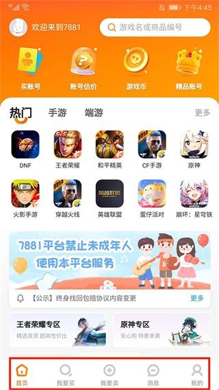 1、打开7881游戏交易平台app,可看包括首页、我要买、我要卖、消息和我的栏目,