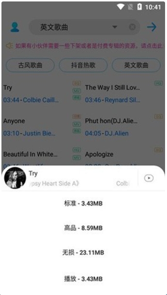 2、所有音乐资源都可以免费在线试听,可以先确认音质和歌词是否符合预期,再决定是否下载。