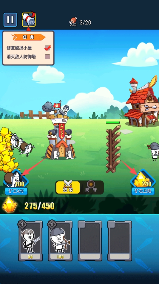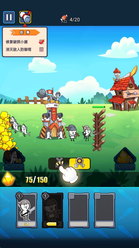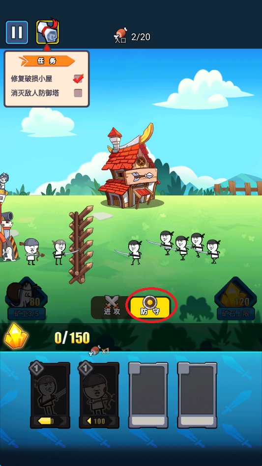 4、当敌人数量众多,可以点击屏幕下方的“防御”,将军队撤回防御设施之后,利用远程输出,积蓄力量。
