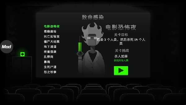 1、该游戏有特别的多的模式,每种模式中还包含特别多的玩法,下面进入第一个知名感染模式,选择电影恐怖夜,这个关卡目标是感染3个人类,然后杀死14个人即可挑战成功,接下来点击绿色的播放键开始游戏吧。