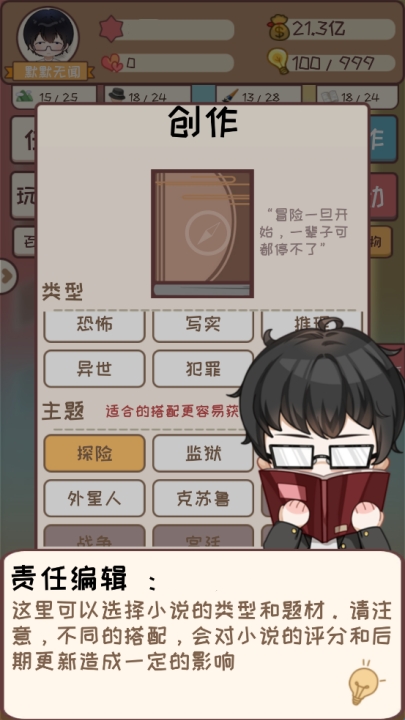 1、一款精彩有趣的模拟经营游戏,扮演一个全新出炉的小说家,体验一个全新的人生。
