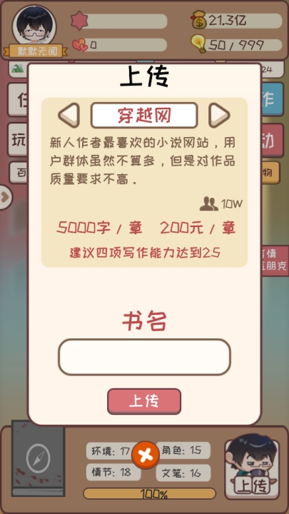 网络小说家模拟器游戏小说剧情人物事件合理搭配,勾起粉丝阅读追逐小说兴趣,粉丝催更呼声越高拿到的粉丝拥护度更高,收益更好,记得坚持每天码字更新。