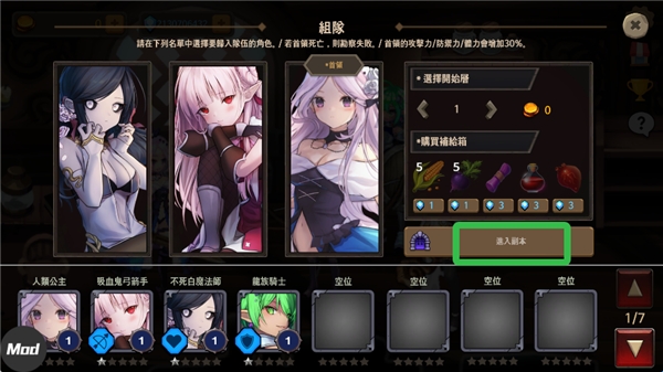 2、在角色中选择一位首领和两位队员。点击【进入副本】。