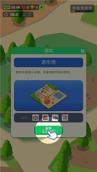 3、设施升级体系:从基础“简易帐篷”到豪华“星空木屋”,解锁“太阳能发电站”“露天影院”等进阶设施增加营收。