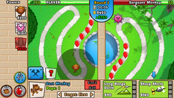 猴子塔防对战版是一款趣味十足的休闲塔防手游,玩家在游戏中将作为一名指挥官,这里所有的猴子都要听从你的命令,安排他们的行动将所有对手击败。进攻模式中你要平衡好造防御塔的数量和放气球的数量,而在防守模式中你不需要放出气球,而是和你的对手比拼在无限波气球的进攻中谁能存活的更久!不管怎么样,站到最后的人才会取得胜利,赚取勋章后解锁新的瘊子塔,更强力的升级和气球等待着你去使用到战斗中!快来加入战斗吧!