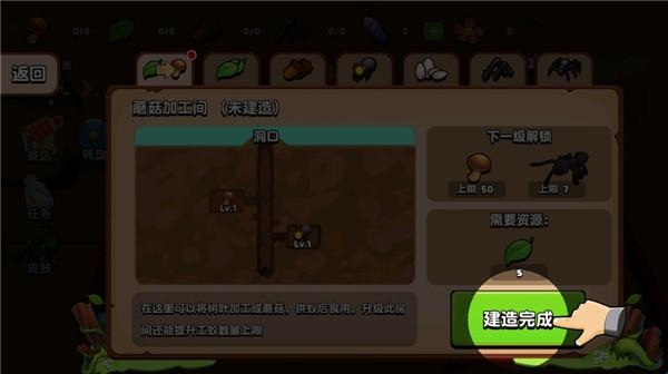 1、刚苏醒的蚁后非常饿,快为它建造个蘑菇加工间吧!