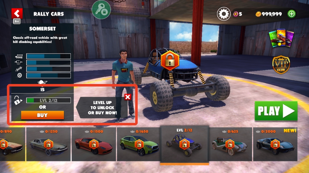 4、等级解锁,升级到规定的要求可以解锁相应的车辆,比如下图这辆SOMERSET经典越野车,你需要到12级才能解锁。