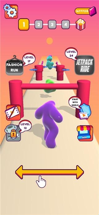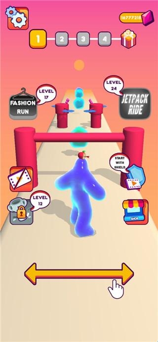 疯狂果冻人原名就叫Blob Runner 3D,游戏以经典跑酷竞技闯关为主题玩法,玩家们可以自由解锁不同类型的果冻人皮肤和各种特殊道具,在不同风格的赛道场景上进行挑战,游戏玩法十分有趣,而且还可以自由切换其他的地图进行全新的体验,玩法规则不需要太复杂的技巧,通关之后还有丰厚的奖励在等你来领取哟。
