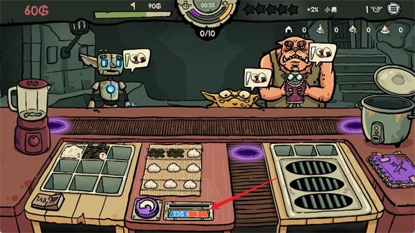 5、右下角的菜单栏会显示当前寿司所需的食材组合以及已生效的强化卡,点击可随时查看配方详情。