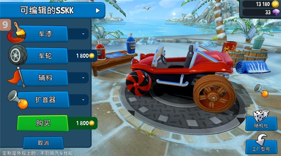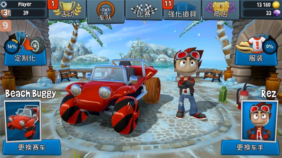 1、灵活的驾驶你的沙滩车进行比赛,利用好获得的每一个道具和自己的技能,帮助自己获得比赛胜利。
