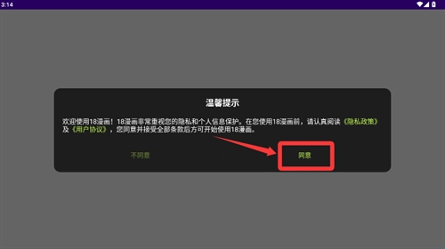 1、启动18漫画后,在提示框内点击同意选项进入应用主界面。