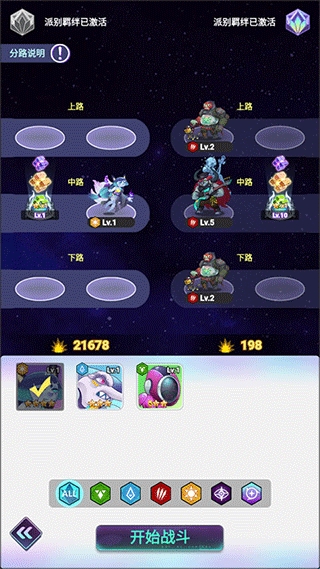 战斗加入“路-路对抗”的“破路设定”,拿到“破路”赛点获取优势,一举击破敌方水晶!每个英雄设定了“前期”、“中期”、“后期”的定位,其实力曲线会根据自身的定位随回合数发生变化。战斗中还设定了连杀数:双杀、三杀、四杀、五杀!己方连杀越高,战斗能力也会随之提高。