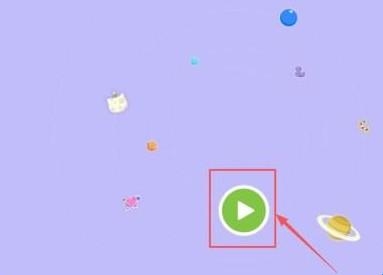 1、在紫色背景界面找到被红框标注的绿色播放按钮,按照红色箭头指示点击这个按钮开始游戏。