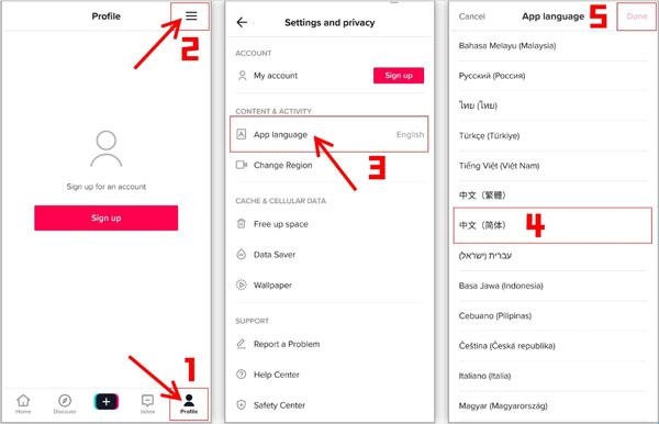 第三步:由于是国际版,首次打开显示的是英文,我们需要设置成简体中文使用,依次点击:Profile-右上角三横-App language-中文(简体)-Done,即可转换。