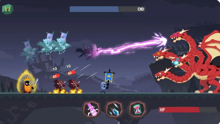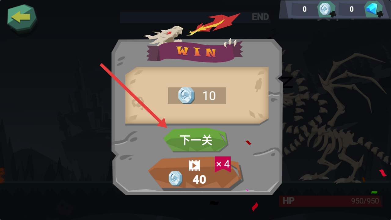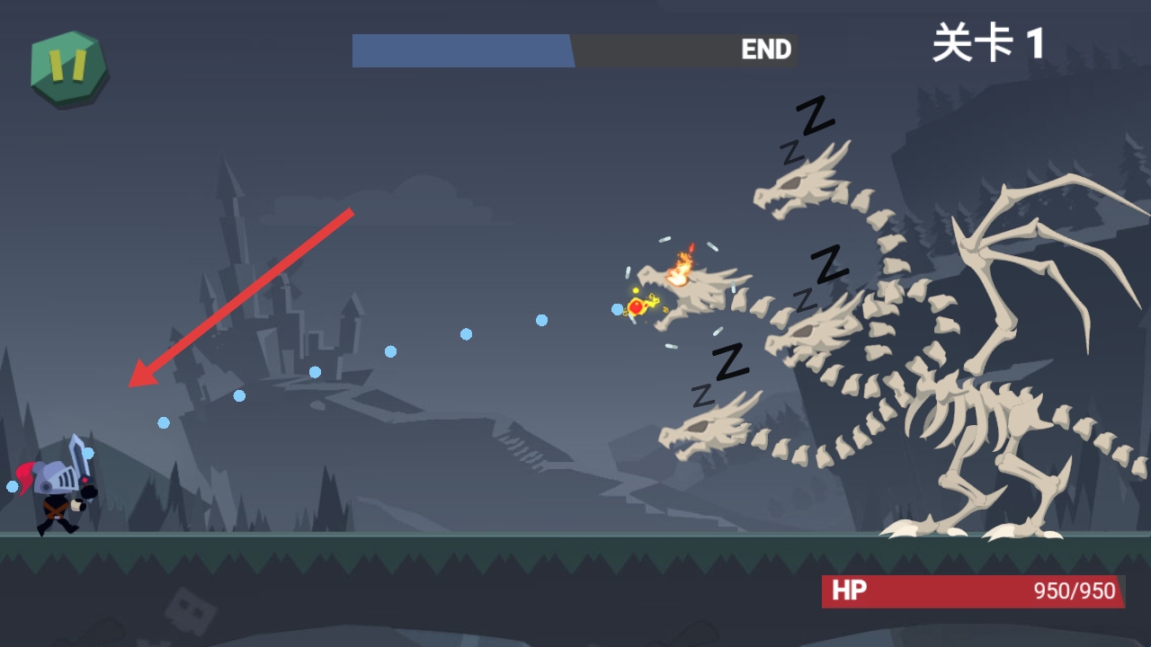 2、战斗时,骑士自动前进、发射子弹,躲避骨龙喷火与弹幕,集中攻击醒着的龙头,消耗其950点HP。