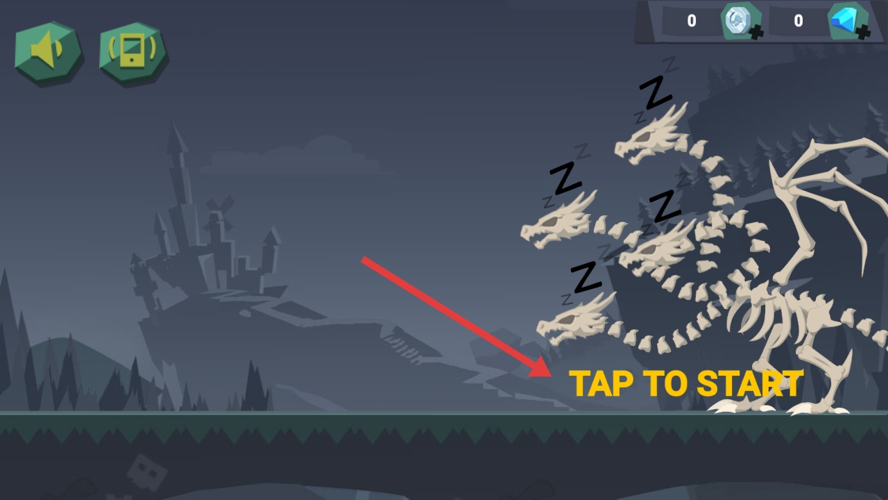1、点击TAPTOSTART,操控持剑骑士,挑战沉睡的多头骨龙,进入关卡1。