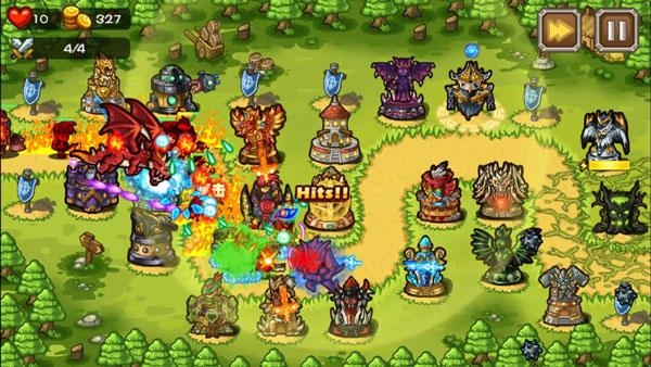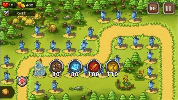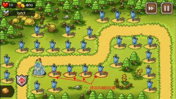 2、地图的左上角显示的是你的生命值、金币余额以及敌人的进攻波数,而右上角是游戏加速和暂停键,通过点击旗帜就能选择你要建造的防御塔类型性,四种不同风格的防御建设是玩家游戏中的必要关注点。