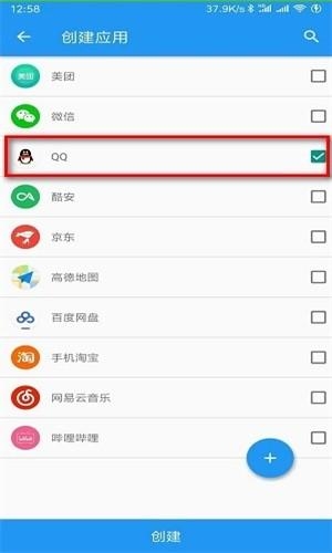 2、在“创建应用”界面中,选择要使用xposed模块的app,然后点击底部的“创建”,这里以QQ为例。