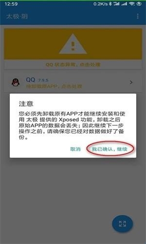 4、接着软件会提示让你卸载原版app,把手机中的QQ卸载掉(注意:要备份好数据,比如聊天记录),卸载完成后,点击“我已确认,继续”。