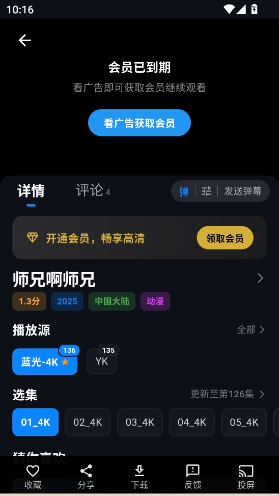 沉浸式播放器:播放界面支持手势控制(亮度、音量、进度)、倍速播放以及画幅比例调整。