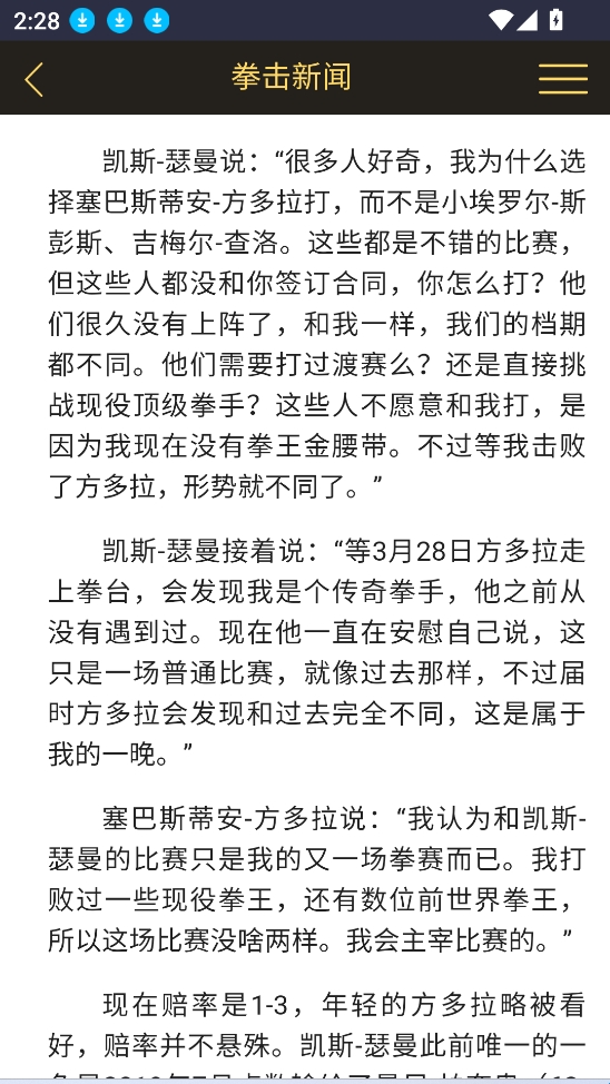 拳击航母专门为喜欢玩拳击用户们提供咨询服务的软件可以在这你快速的查看一些拳击比赛的赛事信息等,跟国内多个媒体都有合作,可以让我们第一时间了解到相关的资讯,非常的全面,还有一些相关的拳击技巧可以学习,喜欢就赶紧来下载试试吧。