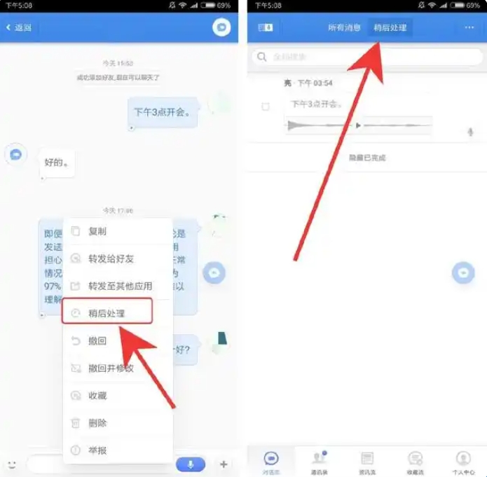 既然生活和工作分不开家,那不如让效率翻倍,在任何聊天界面,用户都可以设置文字消息为稍后处理项,让聊天不再忙乱。
