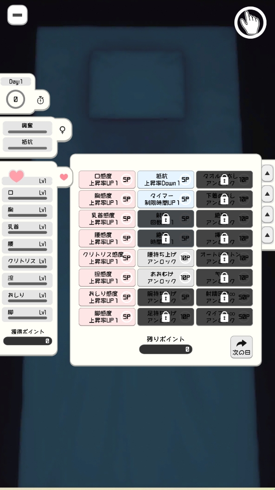 这是一个简单的触摸模拟触摸屏幕操作按摩一个女孩随着灵敏度等级的增加您可以获得积分这可以打开您可以触摸的地方并增加灵敏度的增加速度。按摩的分数是讨人喜欢的体验,反应会根据讨人喜欢而变化,但如果阻力值达到最大女孩就会回家游戏就会结束。