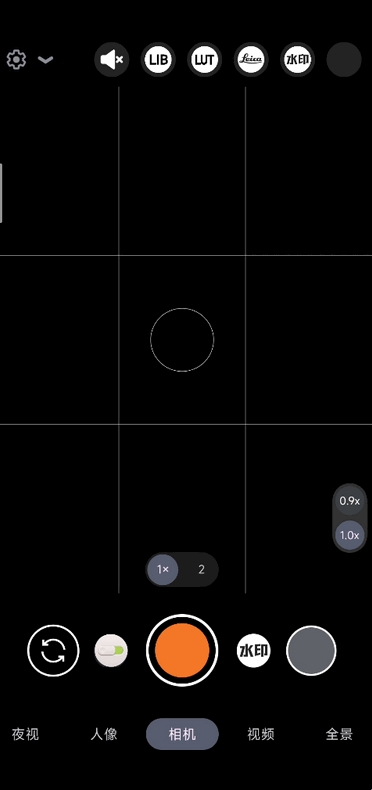 在相机拍摄界面,可调整拍摄倍数(如0.9x、1.0x),点击拍摄按钮进行拍照,还可使用水印功能添加个性化水印。