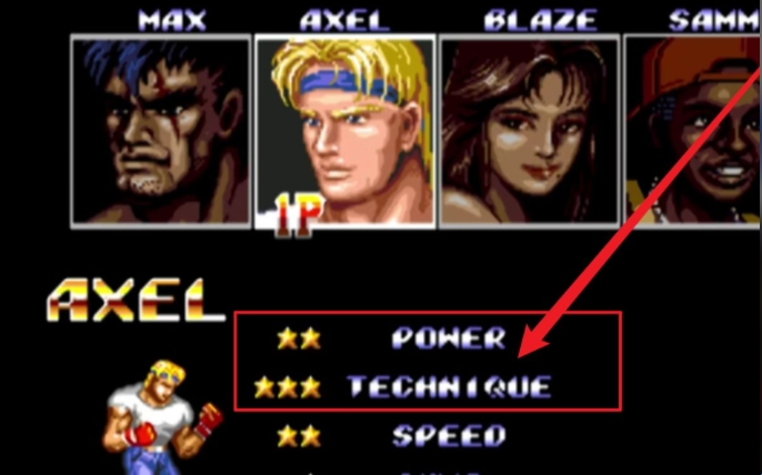 超级AXEL:选择AXEL为主角,然后屏幕上会出现一颗炸弹在倒记时的画面,这时按住1P手柄的START和A键不放,然后快速顺时针旋转方向键直到游戏开始即可,在游戏中AXEL就可以无限使用绝招不扣血,且绝招的攻击力惊人。