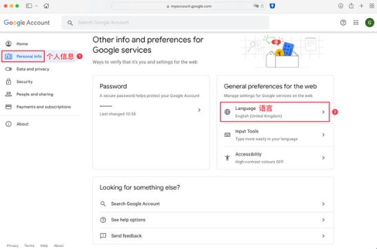 3、点击个人信息(左侧第二个),右侧找到 Language修改语言,例如中文