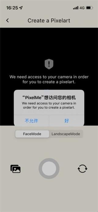 2、允许应用PixelMe访问你的手机相机,点击左侧相册图标即可添加照片,点击中间即可拍照;