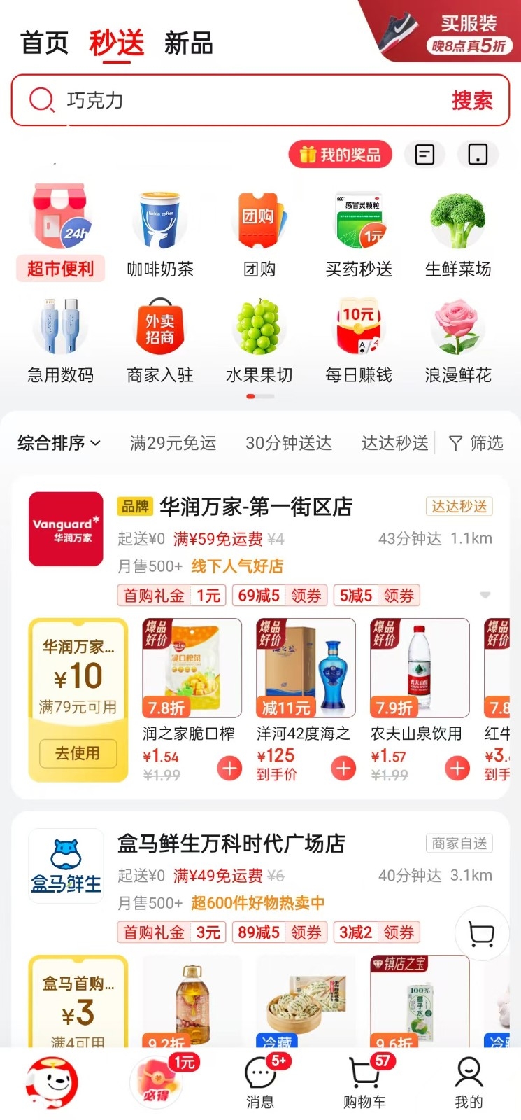 配送体系:依托京东旗下达达集团的即时配送网络(达达秒送),覆盖全国多个城市,配送时效约30-60分钟,但与美团、饿了么相比仍有一定差距。